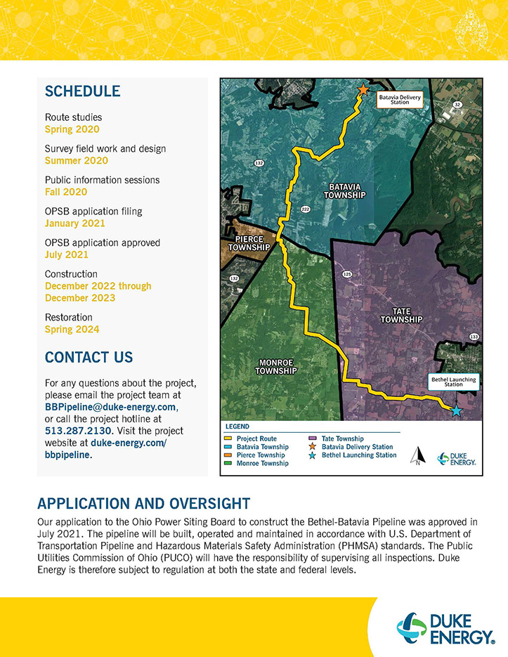 Bethel-Batavia Pipeline Schedule - Duke Energy (duke-energy.com) – Construction schedule (will be updated as necessary by Duke Energy).