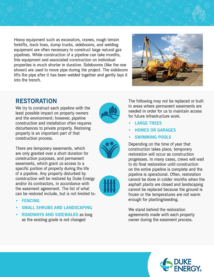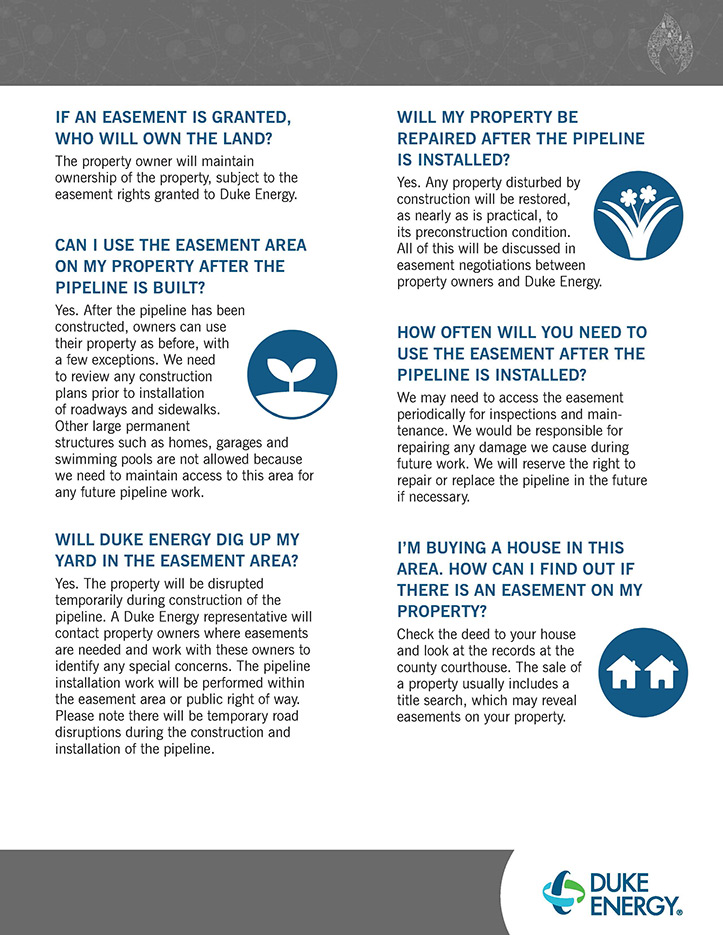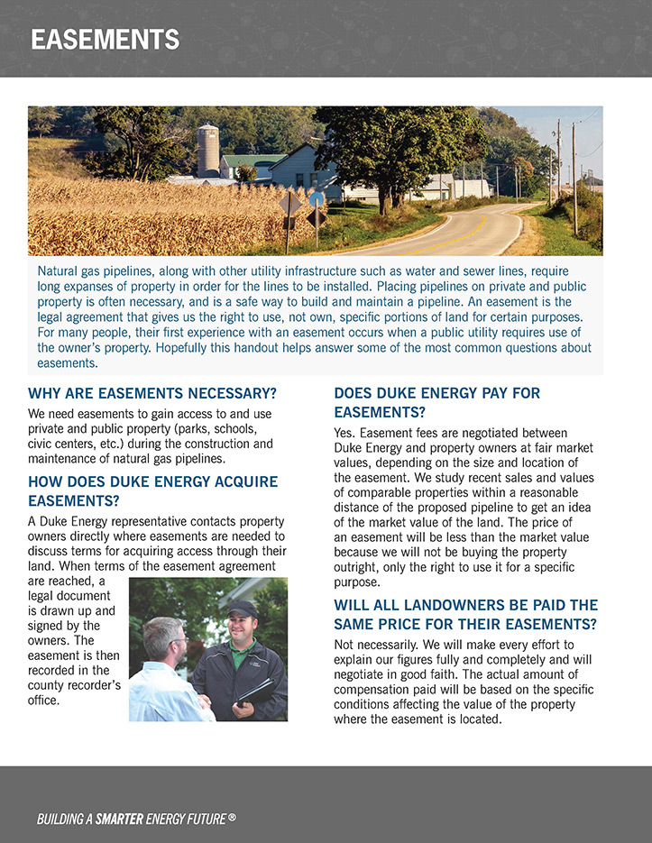 Duke Energy Guidelines for Proper Land Use within Pipeline Easements (PDF) – The dos and don’ts of what one can do in a natural gas easement.